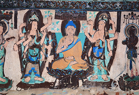 北壁画弥勒经变,上端画弥勒菩萨于兜率天宫为圣众说法的情景,中端画下生成佛后的弥勒佛及弥勒三会的内容,下端画儴佉王及王妃、大臣、宫女剃度出家的情景。