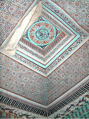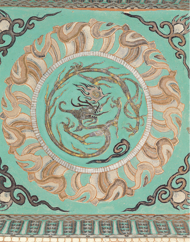 主室窟顶藻井呈方形,画团龙卷瓣莲花井心,井心的浮塑团龙,龙身细长灵巧,张牙舞爪。