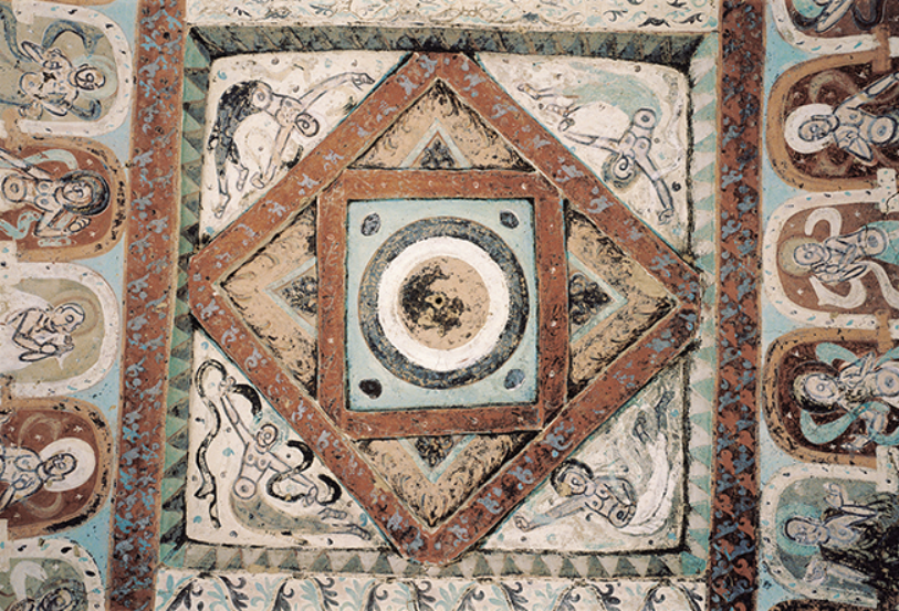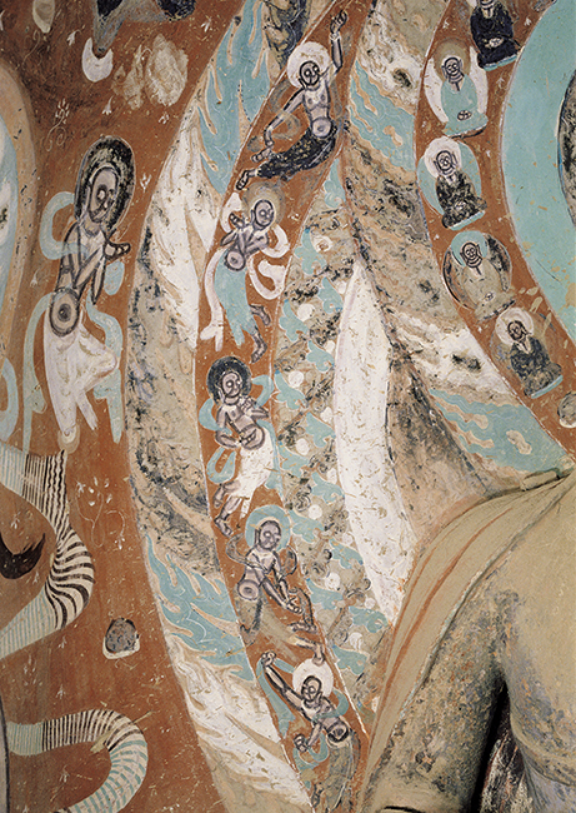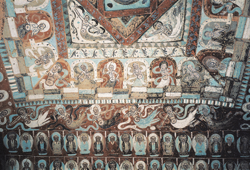 此窟顶藻井浮塑莲花火焰飞天图案,四坡绘有千佛和飞天等。千佛以白、青、绿等冷色调绘制,五组交替出现,形成极具装饰性的道道色光,表现了佛教的“佛佛相次,光光相接”的意境。飞天双腿伸展、衣裙飞扬,极具动感。在四壁和窟顶连接处,绘穹窿宫楼,内有天宫伎乐在演奏横笛、琵琶、腰鼓和海螺等乐器。