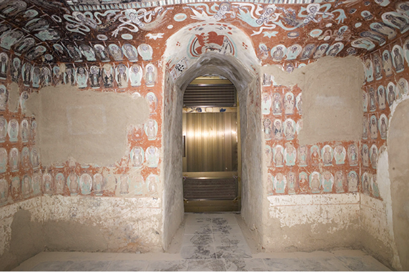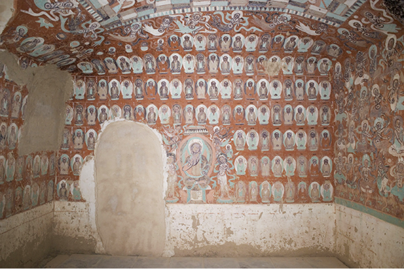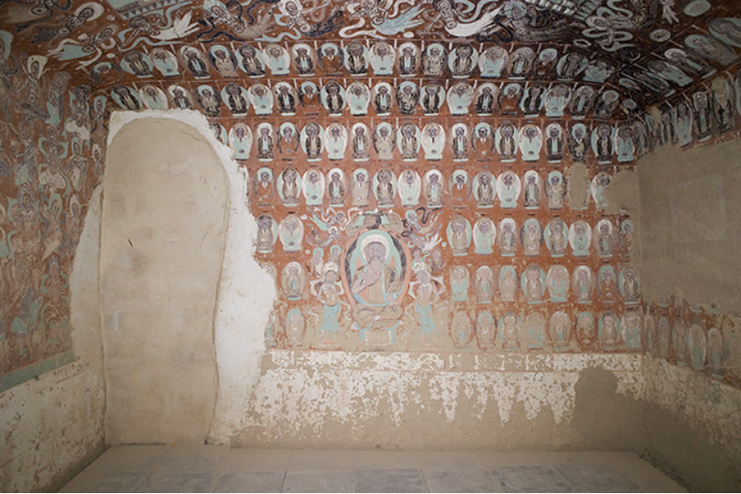 主室南北壁画千佛和说法图,西壁龛内外画供养菩萨,姿态各异,扭腰屈腿颇具印度风格。东壁门两侧画千佛。晚唐发生地震时曾使前壁大部崩塌,五代在窟中部建一土墙才将此窟分出前室、后室,并对局部进行重绘。甬道两壁五代重修,画观音变。