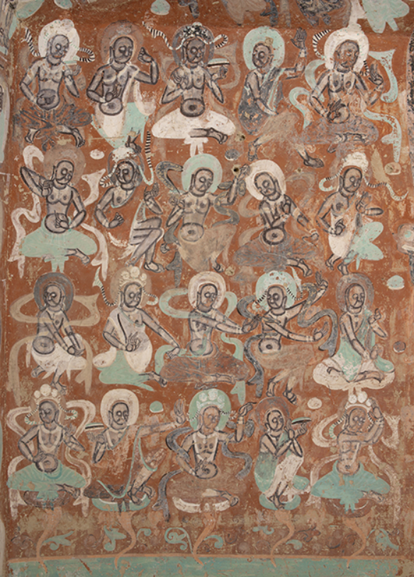此窟供养菩萨的姿态有持花、徒手或坐或跪于莲台之上,并都作舞蹈状,以表示听佛说法时产生的欢欣鼓舞的热烈场面。其特点是40个小菩萨的舞姿竟无一雷同,从而保留下来了古代的四十个舞蹈动作。由于日久年深,人物身上的晕染、线条都发生了变色反应,使其更显得粗犷豪放。这些阿娜多姿的供养菩萨引起了普遍的猜测:多数人认为她们是在表演印度的舞蹈;一些人认为她们是在炼气功,被称为敦煌脐密功;还有人认为她们的招式更像武术,所描绘的是一本印度武功密笈。众说纷纭,她们到底代表什么,仍是一个谜。