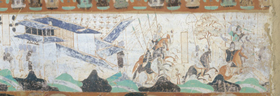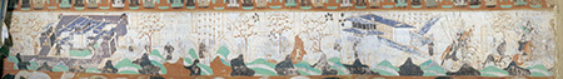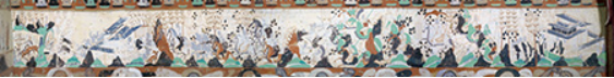 善事太子入海故事。此故事依据《贤愚经》所绘,是一幅绵延三折的大型横卷双栏式连环画,绘在西披南端、南披和东披。可分为28个画面: