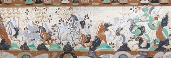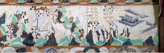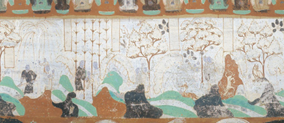 南壁绘得眼林的故事。故事情节由西向东依次绘出6个画面: