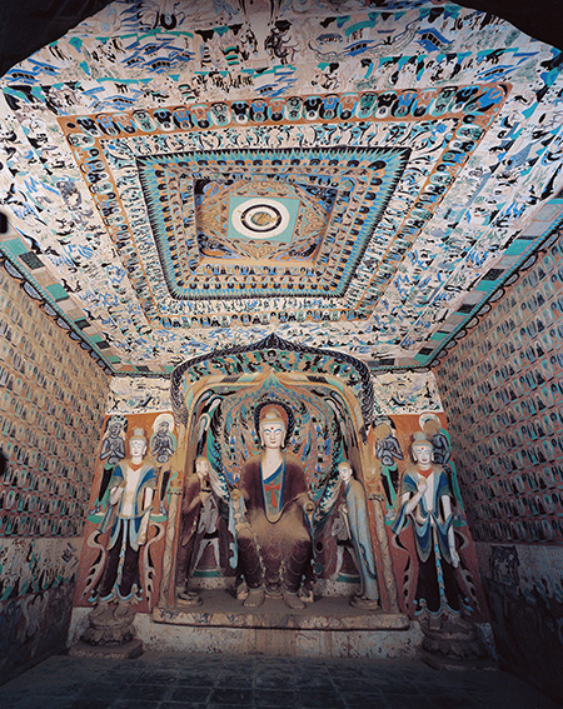 此窟是北周的代表窟之一,主室为覆斗型顶,西壁开一圆券形龛,龛内有彩塑五尊,主尊是倚坐说法佛,两侧各一弟子一菩萨,皆经清代妆修。佛着通肩袈裟,内著僧祇支,胸前结带。面相方阔,高肉髻,大耳扁平,神态端庄。至于主尊身份,由于弥勒佛多取倚坐,则此佛或为弥勒。但佛教艺术中有一种释迦倚坐像,专指释迦曾升天说法,优填王思念释迦,遂派工匠到天宫临摹释迦像,是为“优填王像”。此窟主尊的定名尚需要研究。