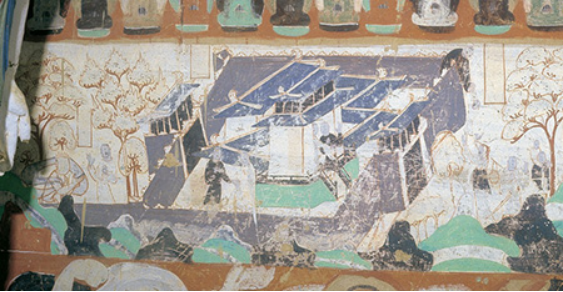 画面一开始就是修建佛塔,六个赤裸上身的泥工正在修建一座砖塔,一人和泥,两人砌砖,两人送料,另外一人在场边挥手指挥。下层正建筑一座小佛堂,下面有砖砌台基,四周用栏杆围住,东西两面各有一身画工正在挥笔作画,屋顶上有上身裸体的泥工,正接房下另一泥工用长杆递上来的泥料,预备给即将完工的佛堂作最后的修整。紧紧相邻的是一座果园,画了三个人在树下休息。下层画着一个病人,由两人扶坐,正张口接受喂药。身后有人正在用药臼捣制药物。旁边画了一辆骆驼车,人畜都在水边休息,水井的东西画了饮骡马、骆驼等情节。画面上气氛轻松、愉悦,表现出在干旱的西北古道上遇到水井的活跃情景。紧接着在下层画了“设桥”,两个中国商人押着满载的驮队正在过桥,桥的另一面来了一位高鼻深目的西方商人,牵着两头重载的骆驼,领着商队在桥头相遇。十分生动地反映了六世纪丝绸之路上东西交往的情景。