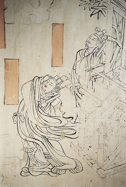 第九窟中心柱西向壁面上的白描图,绘有四组形象:空中飞云中,前有四身天神,形若天王和金刚力士,最前者持长矛,其后者抱持棒状物紧贴腰胯部,与身体平行,后面另一身单行。地面上一字排列三座建筑,两端为亭榭。南端亭内有供桌供器,前站三人,亭后有一持杵舂米的中年男子。东侧亭前站一人。这些人物,除舂米外,均著古代文官儒吏服装,每一组人物侧都有题榜,大都文字泯失或模糊,唯见北端沿题榜内隐约见数字及行款: