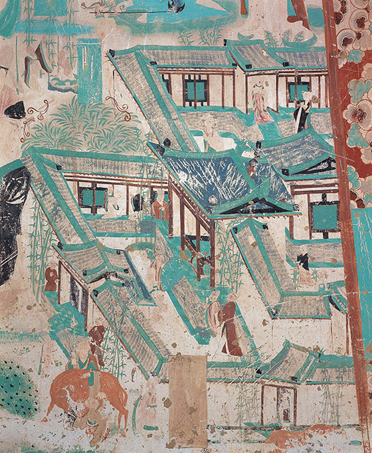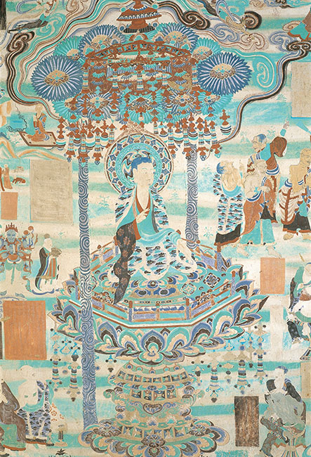 整幅壁画的最下部通壁绘《方便品》中的维摩诘游诸四方善权方便说法教化的内容。全图内容丰富,统一结构布局,有主有次,有虚有实,颇有节律感。