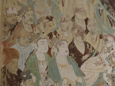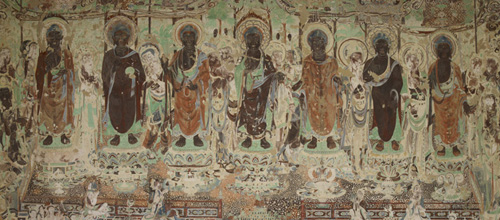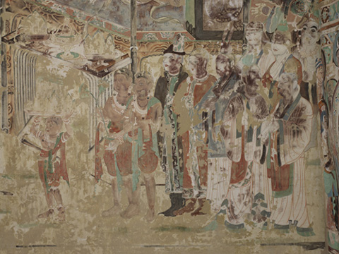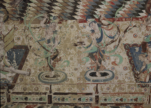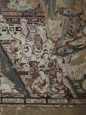 北壁的药师经变,根据《佛说药师如来本愿经》绘成,主尊是七身药师佛,药师佛是东方净琉璃世界的教主,是治疗众生生老病死之痼疾的大药王。他有胁侍日光、月光菩萨,还有十二药叉神将,保护众生免于苦难。画面以东方药师净土七佛为主体,八大菩萨侍立左右。水池中央的宝台,以红蓝两色琉璃铺成,富丽繁华。宝台的栏边,有侧身倚栏而坐的菩萨,手捧莲花,合掌礼佛,水池中碧波荡漾,莲花盛开。宝台两侧是神将和圣众,神将上方是赤身三面六臂的阿修罗,下方是裸体忿怒相的力士。画中的神将,身着甲胄,头戴宝冠,宝冠上饰以动物肖像,现在可辨的有蛇、兔、虎等动物,这是以十二动物生肖对应十二神将。七佛上空飞天翱翔,前临曲池流泉。药师佛前中原式灯楼和西域式灯轮并出,在“灯山火木”照耀下,展现出规模巨大的舞乐场面。两侧乐队共有28人,分坐在两块方毯下,乐人肤色各有不同,演奏着中原汉民族的乐器、西域少数民族的打击乐、吹奏乐和从外国传入的弹拨乐等共15种。两组舞伎在灯火辉煌中翩翩起舞,一组展臂挥巾,绺发飘扬,似在旋转;一组举臂提脚,纵横腾踏,这大概就是传自中亚的胡旋舞和胡腾舞。