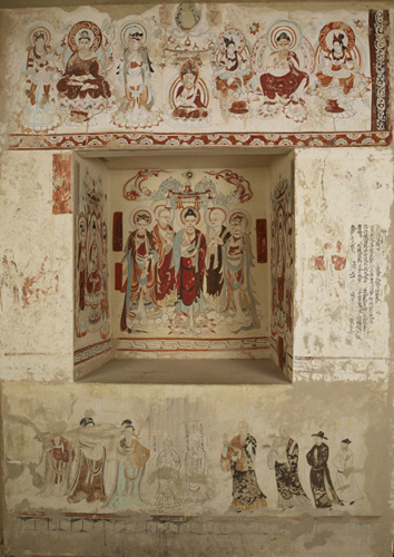 此窟正壁龛内原有唐塑一佛二弟子,均经后代重新装修。龛顶壁画已经残缺,现存部分因多年在宋画的覆盖下,至今保持着明亮的色调,朱色的线描清晰可见。所画菩萨群像和优美生动的供养菩萨,显示出初唐龛顶装饰华丽、细腻而宁静的艺术风格。