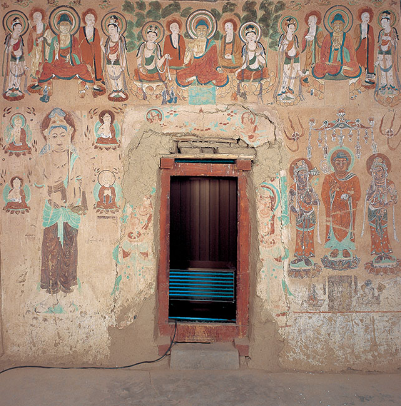 西壁的双层龛为隋朝到初唐流行的佛龛形制。龛内的一铺七身塑像保持完好,中央为佛结跏趺坐,扬手说法。两侧为大弟子迦叶和阿难,外侧两大菩萨及天王。这样的组合形式是唐以来最普遍的组合形式。佛的庄严,菩萨的慈祥,天王的勇武在一起有动有静,有刚有柔完美的结合在一起。