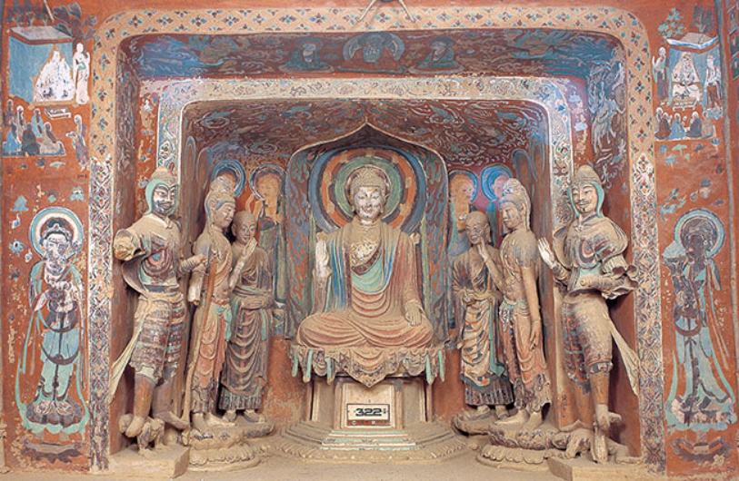 主尊佛像披通肩袈裟,结跏趺坐,右手扬起,掌心向外,作施无畏印,神态安详。造型比例适度,动态自然,衣纹流畅。北侧弟子迦叶披痛肩袈裟,双目炯炯有神;菩萨束高髻,上身半裸,斜披天衣,下着长裙,身材颀长秀丽。菩萨的胳膊经后代重修较为僵直。佛弟子及菩萨的衣纹变早期阶梯式而为波浪式,显得更为自然真实。