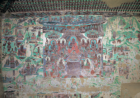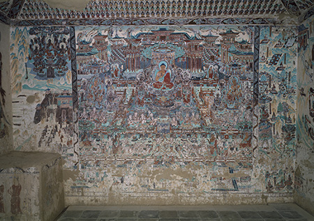 北壁绘观无量寿经变,是依据《观无量寿佛经》绘制的。此经先讲述了“未生怨”的故事:王舍城太子阿阇世,听信提婆达多的恶言,发动宫廷政变,将其父频婆娑罗王幽禁于七重室内,不给饮食,欲令饿死。因其母韦提希王后暗送食物而得不死,遂又将其母幽闭于深宫,不令外出。这时韦提希王后忧愁憔悴,遥礼灵山向佛祈祷。于是,佛和弟子目犍连、阿难现身王宫内,为其讲述前世因缘,原来是国王夫妇年青时曾经为求子而造孽,故尔遭此现世恶报。接着佛又为其宣讲、展示了阿弥陀净土奇妙无比的景象。最后告诉她往生净土的法门——“十六观”。韦提希王后闻佛说法后,欢喜悟解并依法修行,得成正果。