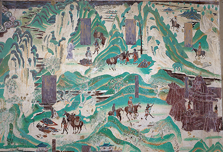 这里把五台山画成草木葱茏的一幅可居、可游的游春图景。这说明画家是在有意识地创作山水画,并且从美的角度来创作。这幅山水画主要表现了四组山峦:左侧一组山峰刻画颇细,以石绿和浅赫相间染出,峰峦上的树除了沿用过去那种装饰性的树形外,又相应地描绘了树的枝叶细部,还画了不少悬垂的藤蔓。右侧是潺潺的流水。中部是一组平缓的山丘,与左侧的山崖相映成趣,用很单纯的笔法勾勒,再平涂石绿色,并着意刻画了不同的树,花开烂漫,一片春色。右上一组山峦最为引人注目的是飞流而下的瀑布,虽已变色,仍然使人感到充满生意,仿佛点睛之笔。左上部的远景,尽管不如前面几组富有特色,却是画面构图上必不可少的,它把左侧近景山崖与右侧一组山恋有机地联系在一起,使山水显得较有纵深感。整幅山水画浑然天成,爽朗而颇有意境:山峦青翠、河流蜿蜒,风吹柳摆,山花烂漫,行人自远而近穿行其间,一派暮春三月的春游景色。