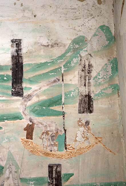 东披南侧绘制的是《譬喻品》,它是《法华经》中最常见的一品,画面中有一起火的大宅院,而宅院中有三个嬉戏游玩的童子。他们的父亲对正在玩耍的孩子说:“这个房子着火了,你们赶快出去。”可三个孩子只是一味地贪玩,不肯离去,父亲只好牵来三乘华丽的车子,告诉他们说:“外面有牛车、鹿车和羊车,如果你们肯离开这宅院,就可以得到车子。”孩子们才急忙从院子里跑出来。这时,着火的院中有许多妖魔鬼怪骑着怪兽四处乱窜。这是《法华经》中一个典型的譬喻故事,这里充满了黑暗、痛苦、充斥着卑劣龌龊之事,三个贪玩的孩子象征生活在这个世界中的人类,尽管已经面临着各种危险,仍然执迷不悟,留恋这个世界。外边的牛车、鹿车、羊车代表佛教的大乘、中乘、小乘,而长者就是佛的化身。《法华经》用这个故事来象征以三乘思想来引导人们跳出苦海。这就是法华经的中心思想——“会三归一”,所谓“会三”是指声闻乘(亲闻佛的教导而觉悟得到者)、缘觉乘(依照佛法,自我修行而得到者)、菩萨乘(即大乘用六度佛法修行,利己利他普度众生者)会于一体。所谓“归一”就是将这三乘归于一乘,即大乘。