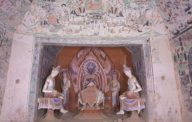 莫高窟第23窟建于盛唐(704—780年),是敦煌盛唐时期最有代表性的洞窟之一。第23窟位于崖面下层,这是一个标准的唐代洞窟——覆斗形窟顶。正面开一佛龛。窟顶为团花藻井;西壁敞口龛内绘画和塑像相结合,表现佛及其眷属,但经过清代重修,失去唐代本身的面貌。洞窟的东、南、北壁及窟顶的南披均绘制法华经变,堪称“法华洞”。窟顶东披绘佛顶尊胜陀罗尼经变、西披绘弥勒经变、北披绘一佛五十菩萨图。