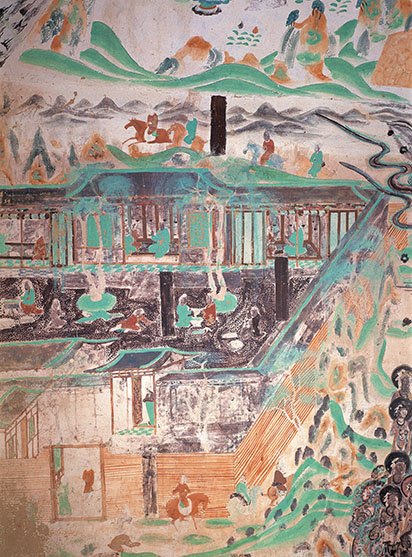 南壁东侧绘制的是《化城喻品》。主品的主旨是宣扬只有《法华经》所主张的“一佛乘”才是成佛的唯一途径。所以经文说:“世间无有二乘而得灭度,唯一佛乘得灭度耳。”但是,要获得“阿褥多罗三藐三菩提”是要经过十分艰苦,往往中途即生退缩之心,于是佛以“方便说法”,用声闻、辟支等暂时引导众生,而最终要使众生到达“一乘佛。”为了通俗的宣传这一理论,经中讲了一个“化城”的故事。大意说:一群人去远处求宝,要经过五百由旬的“险难恶道、旷绝无人怖畏之处。”大约走过三百由旬的路程后,众人感到疲劳和恐惧,于是产生退还的念头。这时,有一智慧的导师,以方便法化出一城,其中楼台亭阁,园林流水都具备,让众人休息。众人即入城,城中财物应有具有,人们不想再前进了。于是导师又把城化去,并且告诉大家,这只是暂时休息之处,不能就此满足,而应当继续前进,最后大家终于到达了取宝的地方,得到了宝物,其实这宝物就是《法华经》。本品经变画就是取材于这个故事。特别是23窟“化城喻品”这幅经变画,则一反旧式,画了一座中国式庭院。庭院外筑有高高的夯土围墙,围墙正面道内有两个男子正往外走,似要迎接客人。庭院内,一个女子站在门口,似是客舍女主人。上房三间,屋内陈设华丽,旅客们对坐矮桌前,从容光焕发地边吃边谈。阶下满地的小黑点,按照相关经文的说法,是以七宝铺地。仆人忙着操办饮食。有的旅客似因疲极而躺在地上休息。围墙外,数骑驰骋于山间小道上,表示取宝人在休息后,继续向宝地进发。在敦煌壁画中如此处理“化城”的,只此一例。
