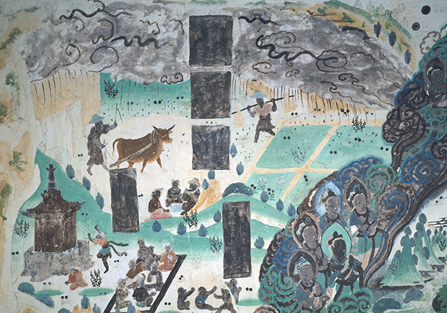 23窟北壁绘《药草喻品》,本品的主旨是宣扬平等的佛慧,有如甘露时雨,普润万物。画家根据经文中的“其雨普等,四方俱下,流澍无量,率土充洽,山川险谷,幽邃所生,奔木药草,大小诸树,百谷苗稼,甘蔗蒲萄,雨之所润,无不丰足”的偈言,画出了一副富有农家生活气息的图画。画面上乌云迷漫,细雨霏霏,农夫正在田里挥鞭策牛,辛勤耕作。另外,田头上坐着农夫,农夫及小儿,父子捧碗吃饭,农妇关切地注视着他们。这一田头小景,富于诗意。在这幅画的下面,画家又根据《方便品》中:“若使人作乐,击鼓吹角贝,乃至童子戏,聚沙为佛塔”等偈言,画了一人跪于佛塔前,一人翩翩起舞,六人各执乐器席地而坐为舞者伴奏,一旁有几个胖娃娃,正在津津有味地聚沙成塔。通过这些画面,告诉人们,成佛有种种方便途径。例如:“起塔、修庙、聚沙成塔、画像、香花供养、雕像、音乐供养、礼拜、念佛”等。若把上下两幅壁画联系起来观赏,就是一幅优美的“雨中耕作”与“欢庆丰收”的连环画。这些画面缩短了彼岸佛国与此岸人间的距离,把想象中的佛国变成了可以看得见的人间乐园,从而扩大了佛教在民间的影响。