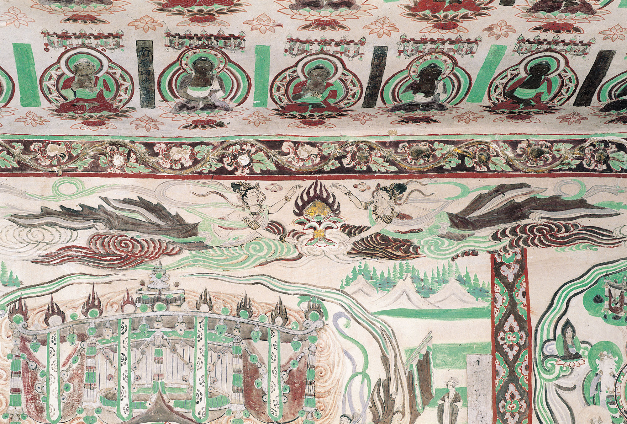 内容:甬道盝形顶中央元画接引佛;南披元画幔帷,底层宋画屏风;北披元画幔帷,底层宋画屏风、唐画璎珞边饰。