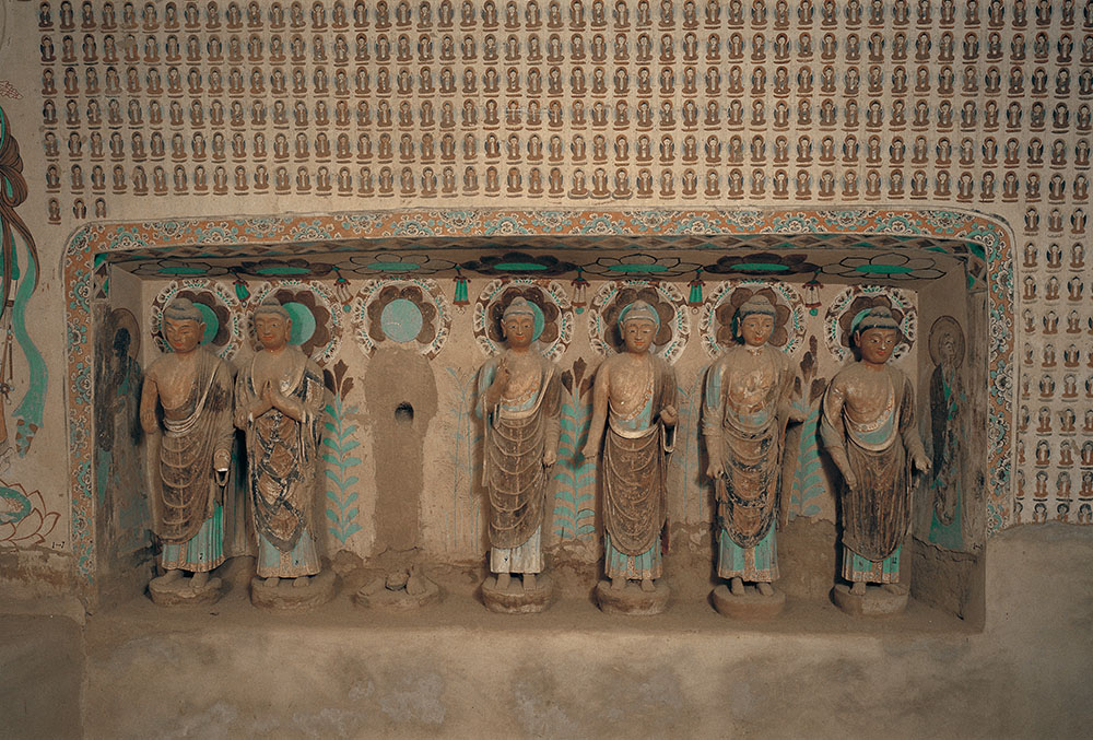 北壁七佛龛内存有唐塑宋重修的立佛六身。过去七佛,是指释迦牟尼佛及其之前的过去七位佛,为过去在娑婆世界度众的七佛。