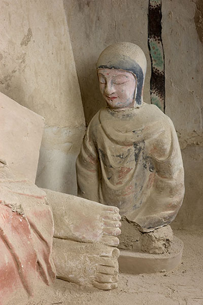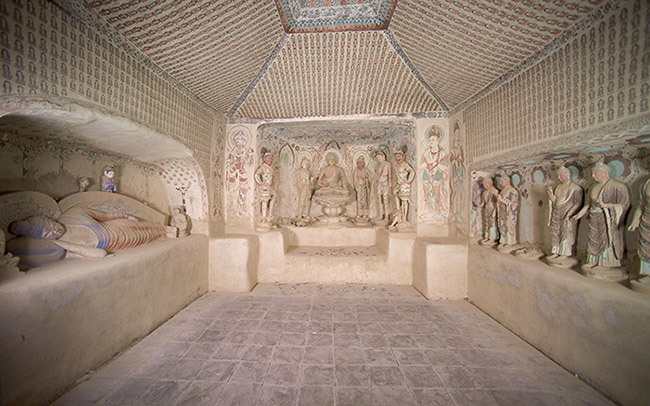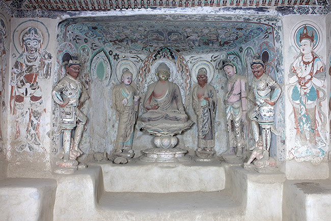 洞窟三面开龛,西壁平顶敞口龛内塑趺坐佛、阿难、迦叶、菩萨(清修)及南、北天王各一身。佛龛内塑像虽部分经清代重新着色,但基本保存唐代风貌,特别是西壁龛内主尊释迦牟尼结跏趺坐于莲花宝座上,身着袈裟,衣纹自然流畅,疏密得当,仿佛是一种柔软、轻薄的丝绸缠绕在身上,形象的表现出了丝绸的质地。左手抚膝,右手平举掌心向外做施无畏印。为了把佛的庄严与神圣塑造得更完美,在佛的背后加饰圆形图案,表示头光与背光。佛左侧塑弟子迦叶,迦叶全称摩可迦叶,居释迦牟尼十大弟子首位,以苦修著称,故称“头陀第一”。所以一般将其表现为老者形象。此身迦叶塑像身穿袈裟,身材清瘦,肃容直立,双眉紧锁,表现出苦行僧的庄严肃穆,冥思苦想和老成持重的特点。右侧是阿难,阿难全称阿难陀,原是释迦牟尼的堂弟,十六岁时随佛出家,侍佛二十五年,因多闻佛法,长于记忆,故称“多闻第一”。此处的阿难眉清目秀、面容俊朗、鼻梁高挺、嘴唇饱满,加上微微倾斜的身体,活脱脱的表现出了一个聪明伶俐的少年形象,与对面的迦叶老者形象形成鲜明的对比。北侧菩萨身形修长,体态饱满,侧身扭腰,神情温婉慈和,好像注视着前来礼拜或观瞻的人。