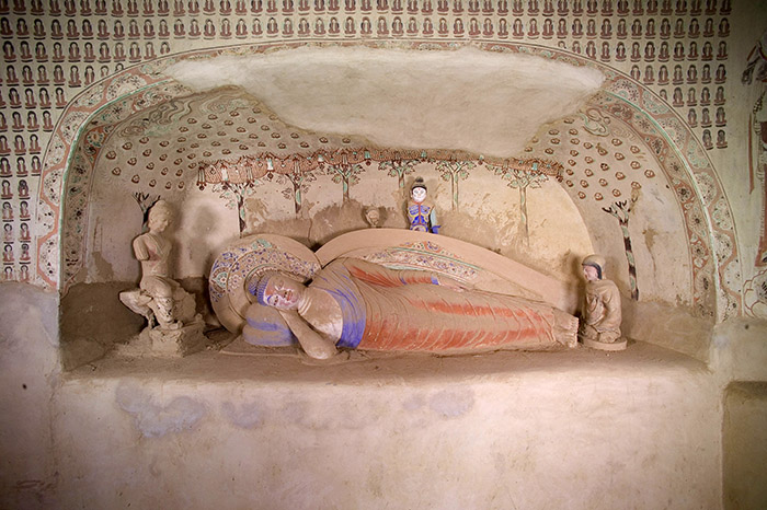 佛教认为,世界的一切,其本性都是“苦”,在人生的历程上充满了苦,它是一个无边的大苦海,怎样才能解脱苦难、获得永恒的快乐呢?唯一的出路只有修真悟道、断绝世俗诸苦,得以产生的一切原因、以无上正等正觉而进入涅槃。所谓涅槃,是梵文Nirvana的音译,意为灭、灭度、灭寂。它是佛教全部修习所要达到的最高境界,是指熄灭生死轮回而后获得的一种精神境界,使灵魂得以脱离肉体,从而解脱人世间多种苦难烦恼和多种思想行为,进入不生不灭的境界而永享极乐。为了宣传佛教这一重要思想,在石窟中便塑造了释迦牟尼涅槃像。