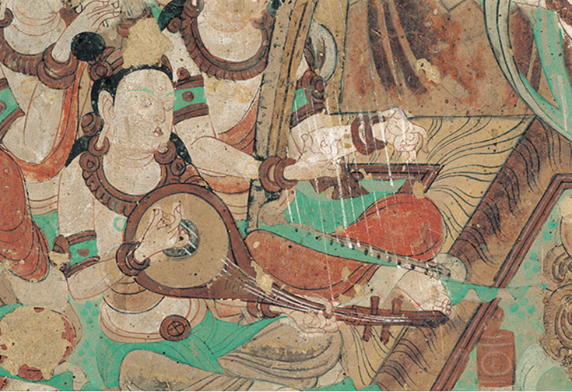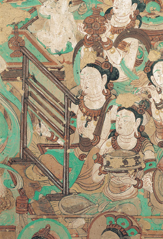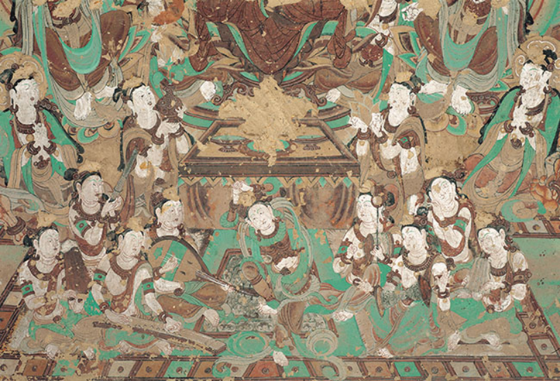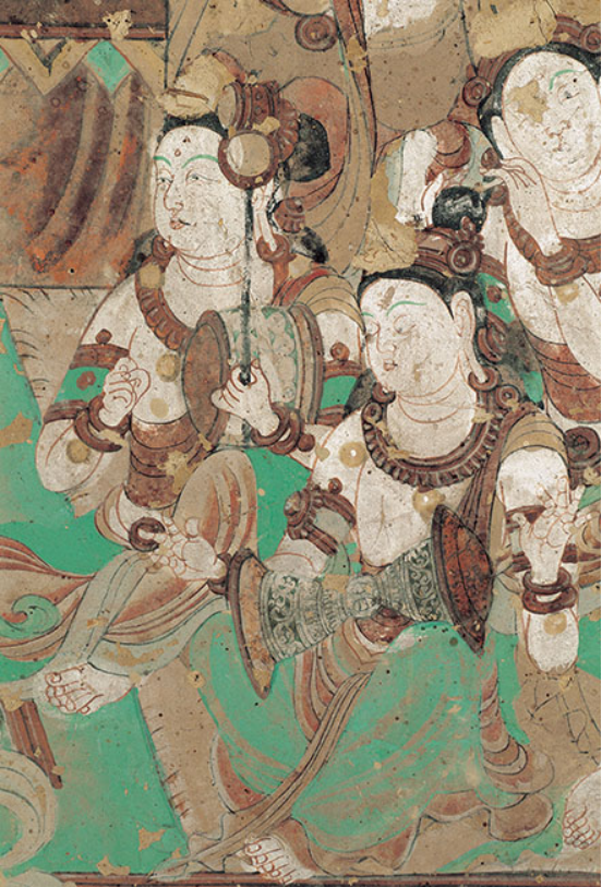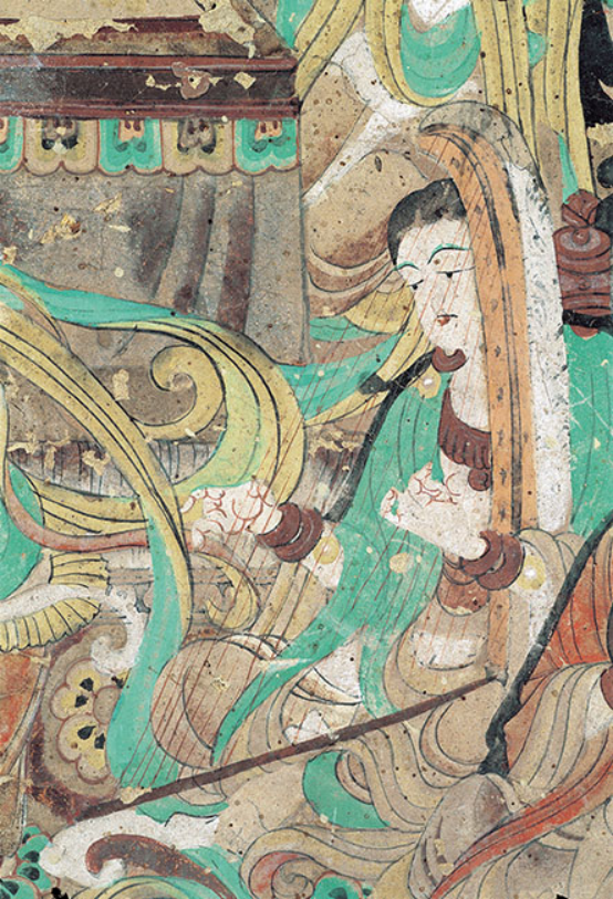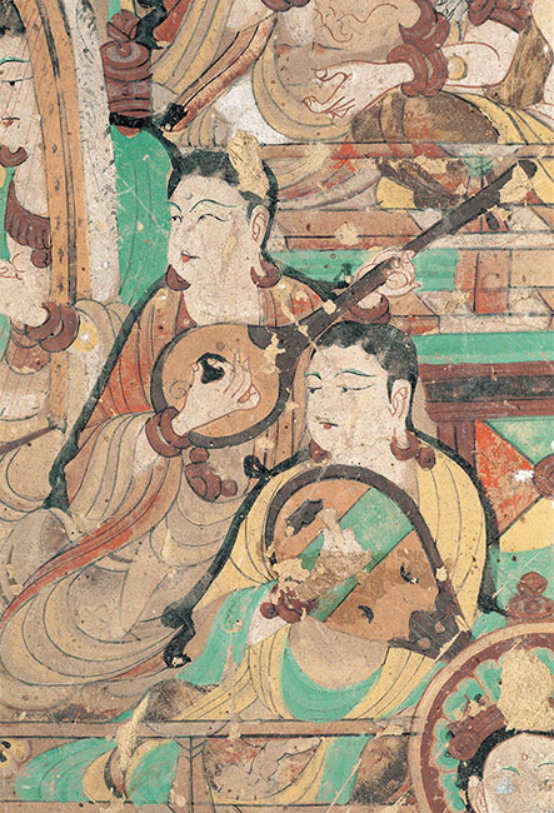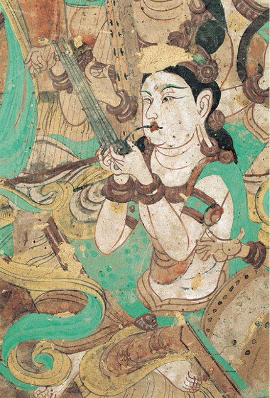 此窟观无量寿经变中的反弹琵琶伎乐天是莫高窟同类题材中的佼佼者,她反背琵琶,踏足而舞,舞带展卷,节拍鲜明,神情沉着自然。最突出者,双脚拇指翘起似在晃动,以应节拍,这种特殊的舞技,可以看出印度舞蹈留下的影响。