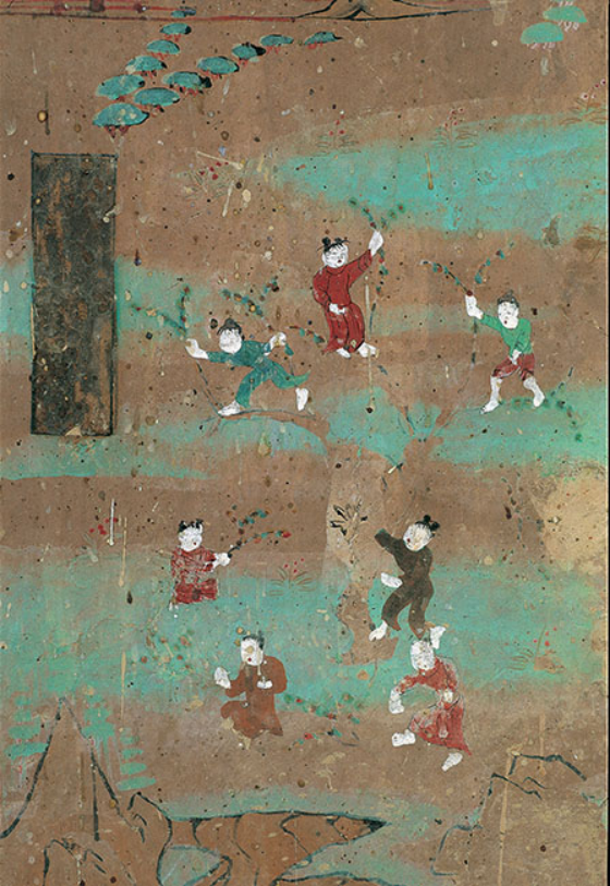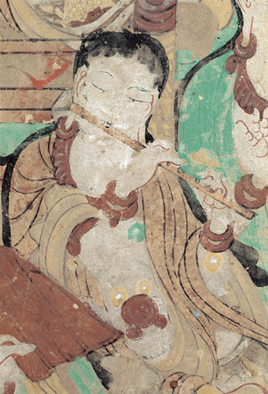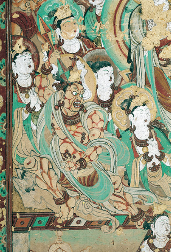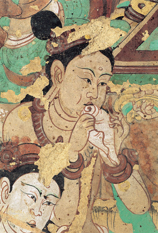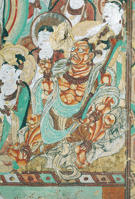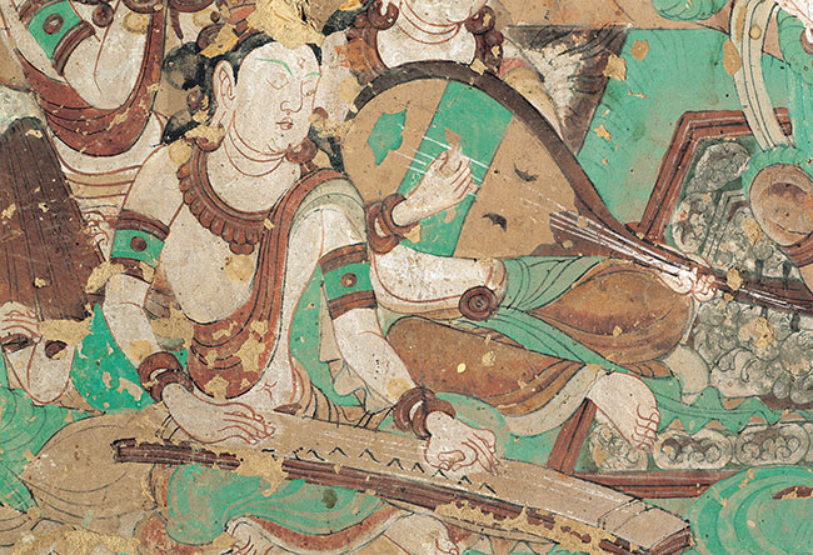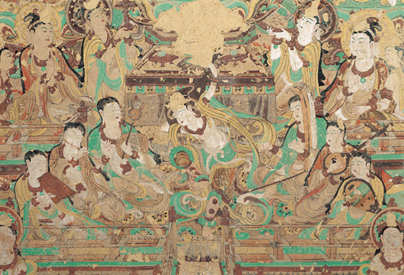 此窟观无量寿经变中的反弹琵琶伎乐天是莫高窟同类题材中的佼佼者,她反背琵琶,踏足而舞,舞带展卷,节拍鲜明,神情沉着自然。最突出者,双脚拇指翘起似在晃动,以应节拍,这种特殊的舞技,可以看出印度舞蹈留下的影响。