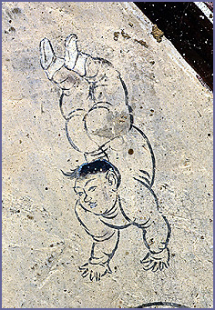 中国民间美术中的胖娃娃,显然不是近代才兴起的东西,从莫高窟的化生童子中可以追溯它的源头。在封建思想统治下的艺术中,裸体造像是罕见的,印度西域式丰臀大乳的裸体造像,传到敦煌变了样,有的学者统计莫高窟的裸体飞天共15身,可是如果加上这些小娃娃,莫高窟里便有一大批裸体人像了,不过就一般中国人的心理而言,裸体童子似乎算不得裸体,从这个角度看,可以说他们是外来艺术与中国传统思想妥协的产物。