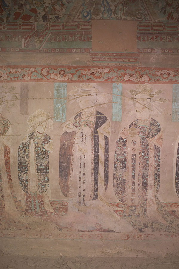 洞窟甬道是盝形顶,顶部中央绘制着千佛变,甬道南、北披各绘制着药师佛立像十四身,甬道南、北壁每一面都是元代绘制的四身供养菩萨。