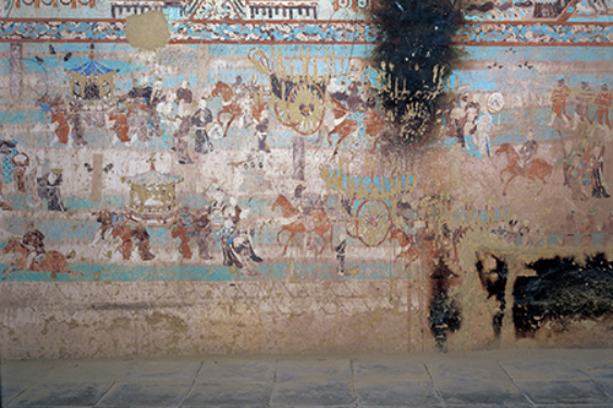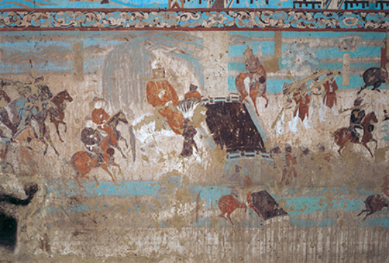 乐队之后,大道中央是辎车一辆,白马驾辕,二驭者左右夹马扶辕而行,前有榜书“司空夫人行李马车”。车后女侍8人,或持团扇或捧包袱等。随后八抬大轿两座,轿为尖顶六角,下设壶门,轿夫着红色缺裤长衫,氈帽氈靴,弓腰喘行,表现出负重之感。后各随侍者六人,右男侍,左女眷,紧接着辎车四辆车后女官一身,头戴花冠,引辔执鞭,胯下红马缓行。马后乐女四人,右两人僧服,削发。乐器有琵琶、箜篌、笙。左右银刀手八身,接着便是主角——宋氏。前有题字“宋国河内郡夫人宋氏出行图”。宋氏形象高大,头戴花冠,后插发钗,穿青色大袖交领衣,胸部束裙,骑硕健的长鬃白马。主人的衣褶、头饰、马鬃等处,线条清晰,显系后人重描。右侧马僮,左侧女侍,拱手相随。马后进跟着女僚九骑,部分扮作男装,或捧包袱,或执团伞,前四后五两列紧随。壁画的最后部分转至东壁北侧,幕僚六骑在前接续驮运,一骑射练兵的场景结束。