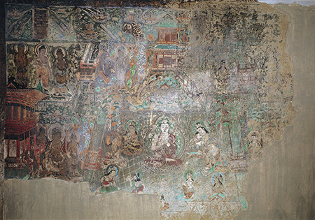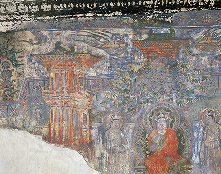 北壁画阿弥陀经变一铺。《阿弥陀经》也称《小无量寿经》,姚秦(公元384——417年)鸠摩罗什所译。本经的内容是说有一次释迦牟尼在舍卫国祗树给孤独园给舍利弗等众弟子讲解了西方极乐世界的美妙景象和阿弥陀佛的无限功德,宣称只要发愿皈依佛法,念念不忘阿弥陀佛的名号,死后即可去极乐世界生活。由于该经详细地讲述了大乘佛教关于彼岸世界的观点,对于向往美好来世的广大信徒具有极强的感召力,加之文句通俗,篇幅不长,容易背诵,修行方法简便,所以流传很广,影响很大,也是净土宗信仰者每天必读的功课。