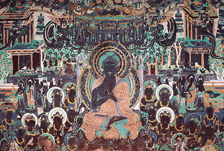 中间的说法会中,主尊阿弥陀佛及菩萨的肤色已经氧化变黑,但主尊佛的“顶光”放光仍可看的很清楚,其光所到之处,都有一位千佛,被安排在华盖的周围,这种表现方法很别致。主尊佛的袈裟衣纹,密集而合理,很写实,反映了古代工匠对生活的细致观察和深刻理解。