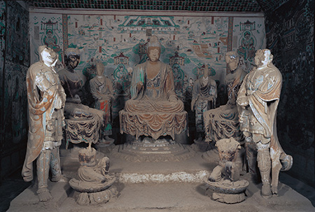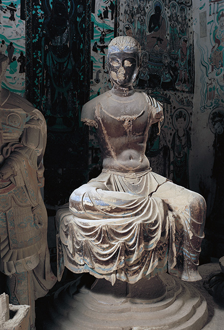洞窟正中设中心佛坛,佛坛上的塑像为初唐原作,保存至今已有一千三百多年。虽然变色较严重,但雕塑技艺非常精湛。主尊像释迦牟尼佛体态端庄,结跏趺坐于莲花座上,由于塑造手法写实逼真,身上的袈裟自然垂落于莲花座上,似被莲座上的莲瓣自然挑起,极富丝织物的质感。左侧的这身菩萨像,上身袒裸,下穿锦裙,侧身单腿盘坐于莲花座上,神情沉静、温婉,造型娴熟,比例准确。宽厚凝重的肩背、富有生机的胸腹,塑造的非常精到。尽管双臂已失,色彩已变,但从自然倾斜的姿态、丰满的身躯,特别是给人以肌肉丰肥之感的背部深陷处以及垂挂在莲瓣周围富有装饰性的锦裙折纹里,都体现出唐代艺术所崇尚的“浓丽丰肥”的时代风格。北侧的这身天王像是敦煌彩塑的代表作之一。天王内穿甲胄,外着虎皮衣,两手相握于腹前,挺胸直立。甲胄严整,虎皮柔软厚重。虎皮衣,吐蕃叫“大虫皮”。虎皮衣帽是吐蕃表彰英雄的服装。这身天王像虽然面部残缺,但通过动作、姿态仍可见建立战功的武将的雄健威风之气概。着虎皮衣的彩塑天王像仅见于此窟。
