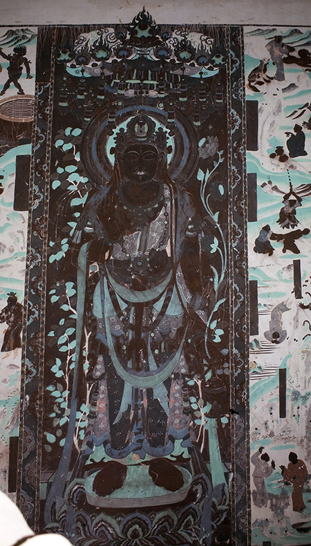 在洞窟的四周绘制经变画及说法图,变色较严重。西壁北侧绘有一幅观音菩萨与供养人图。画中的观音菩萨顶光闪耀,脚踏莲花,斜底着头,以两手指捏着串珠的一端,俯视着脚旁的供养人。观音脚边的女供养人身着窄袖裙衫,肩披罗巾,手持香炉,握住观音手中串珠的另一端,仰视观音。男供养人身后的侍从捧着供物,奉献观音,观音与女供养人之间的感情巧妙地通过串珠和视线联系在一起,神与人的关系处理得极为微妙。