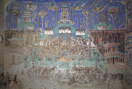 北壁的西方净土经变上部分内容以蓝色为底色,表示天空,约占了整幅经变画的三分之一。在蔚蓝的天空中,流云飘动、天花飞落、天乐不鼓自鸣。画面中可以看到有古琴、琵琶、方响等乐器,虽无人吹拉弹唱,却飘荡在天空中散发着美妙的音乐,十方诸佛驾祥云听法,而在天空中的飞天与众佛菩萨的姿态相比,是那么的从容,洒脱而又自由自在。画家以高度的技巧,运用圆润细腻的线条,描绘出了飞天特有的风骨、神思,以及飞翔时的气韵和意境。虽然飞天的肤色已经氧化变色,但仍能够感受到他们的优美造型。这几身飞天的存在使画面变得更生动活泼起来。中间部分是阿弥陀佛端坐中央,双手作说法印,神态庄严慈祥。观世音、大势至两位菩萨分立两侧,其他听法的菩萨或坐或立,有的认真听法有的低头沉思。而有的菩萨则依栏冥想,凭栏眺望。下部分是水上平台,中间为舞乐,乐师拿着不同的乐器伴奏,如琵琶、笛子、笙、拍板等,中间有两身舞者,反映了佛国世界歌舞升平场面。这铺西方净土经变没有绘制小故事,而是通过对美好场景的想象和创作,以壁画的形式为世人展现出了西方极乐世界种种美好,借以满足人们希冀幸福生活、祈望摆脱痛苦的真诚愿望。