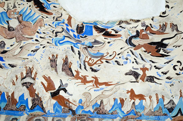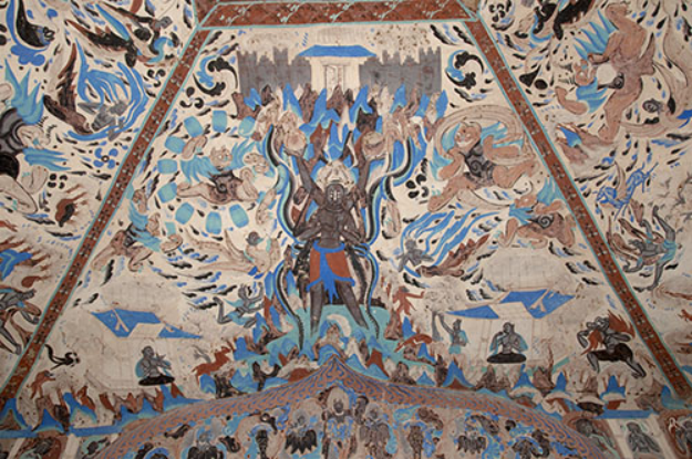 统观整个洞窟顶部的壁画内容,四披顶上部画满了来自佛教和中国传统神话中的神灵,而各顶又各有主体。东、西披以佛教中的阿修罗和摩尼宝珠为中心。南北则以中国传统神话中的东王公、西王母为主神。组成浩浩荡荡的巡天行列。在下部则画山林野兽和狩猎场面,形成了一种整体的空间感。这正如王延寿在《鲁灵光殿赋》中说的:“图画天地,品类群生,山海神灵,写载其状,托之丹青。”