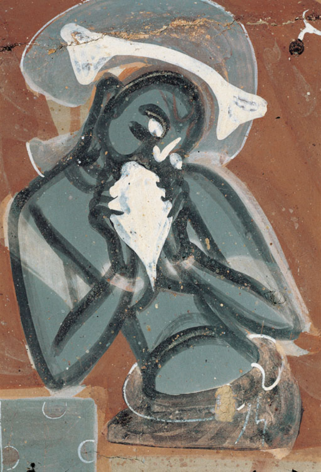 还有“耳出于顶”,裸体披巾,臂生羽毛,奔腾于空的“羽人”。也就是王充在《论衡》中所讲的“千岁不死,羽化升天”的神仙。通常在汉晋时的墓穴中出现,作为引导死者灵魂升天的异引之神。中国式的大力士“乌获”,和“头似鹿,背有翼”的风神“飞廉”。在洞窟的西披中部有一个非常有趣的人头鸟身的形象,有人认为这是千秋鸟,(又名禺强)。在《经律翼相》中讲:“千秋,人面鸟身,生子还害其母,复学得罗汉果。”也有人认为这是雷公的下属“斫木”。因为在《古小说钩沉》辑《古异传》说:“斫木,本是雷公采药使,化为鸟”。