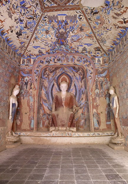 莫高窟第249窟开凿于西魏。覆斗顶殿堂窟,西壁开一龛,东壁毁,南、北壁绘千佛,中间绘说法图一铺。窟顶绘中国传统文化题材和佛教题材。