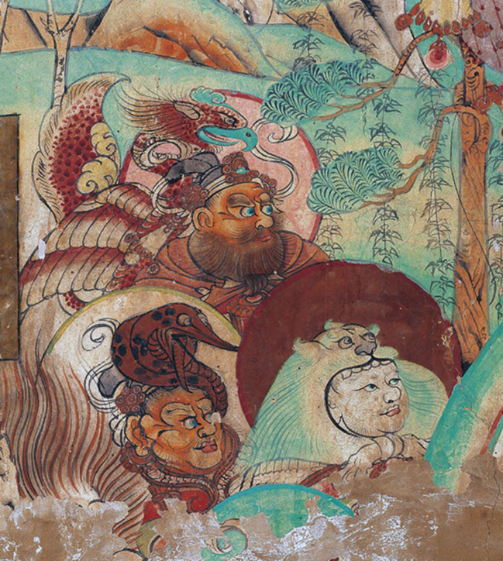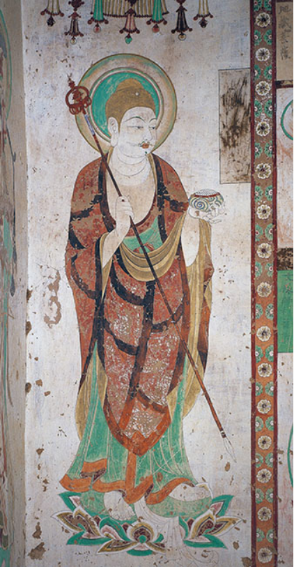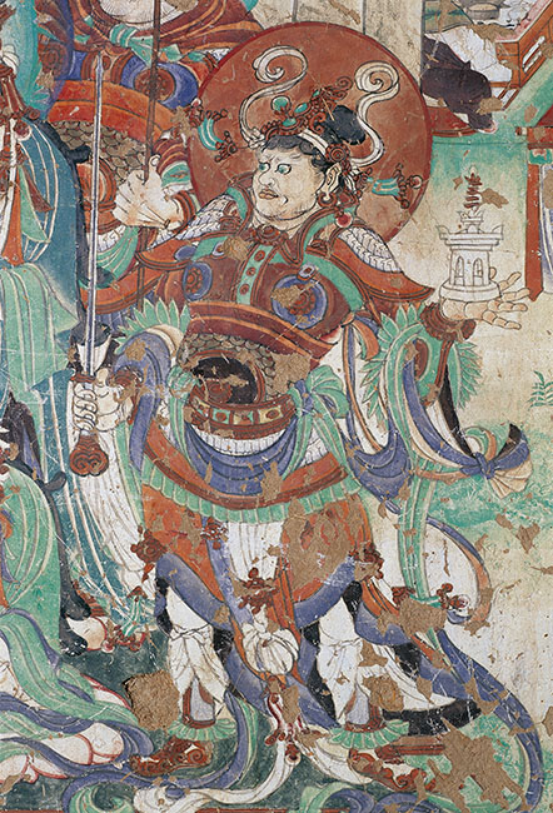 东壁北侧绘北方天王,头戴宝冠,怒目圆睁,身着吐蕃装甲胄,左手托五柱空心塔,右手持三叉戟,座下压着两只夜叉鬼,身后跟随侍从。北方天王,音译为毗沙门,意译为多闻天王,是佛教中守护北方之天神。北方天王的北侧是随行护法的毗沙门天王的二太子形象,左手托宝珠,右手握宝鼠,头披大虫皮(虎皮),作虎口含头的样子。吐蕃人把虎皮叫大虫皮,也叫波罗皮,用虎皮缝制的衣帽是吐蕃人表彰英雄的服装:“贵人有战功着,生衣其皮,死以旌勇”。莫高窟中唐第205窟佛坛北侧的天王塑像与此相同。莫高窟吐蕃时期的供养人题记中也有“……大虫皮康公之女……”的记载。佛典《毗沙门仪轨》记载,公元742年,大食(现在的伊朗一带的阿拉伯帝国)、康(现在的今乌兹别克斯坦撤马尔罕一带)等五国军队围攻瓜州,瓜州城告急,应瓜州之邀,毗沙门天王立即派遣自己的二儿子独健率领天兵天将援救瓜州。独健一行三五百人身着铠甲,腾云驾雾般神速抵达瓜州后,鼓角大鸣,声震百里,地动山崩,云雾蔽日。敌营中的弓弩弦被金鼠咬损,器械损断尽不堪用,五国大惧皆退军。手握金鼠是独健的形象特征。