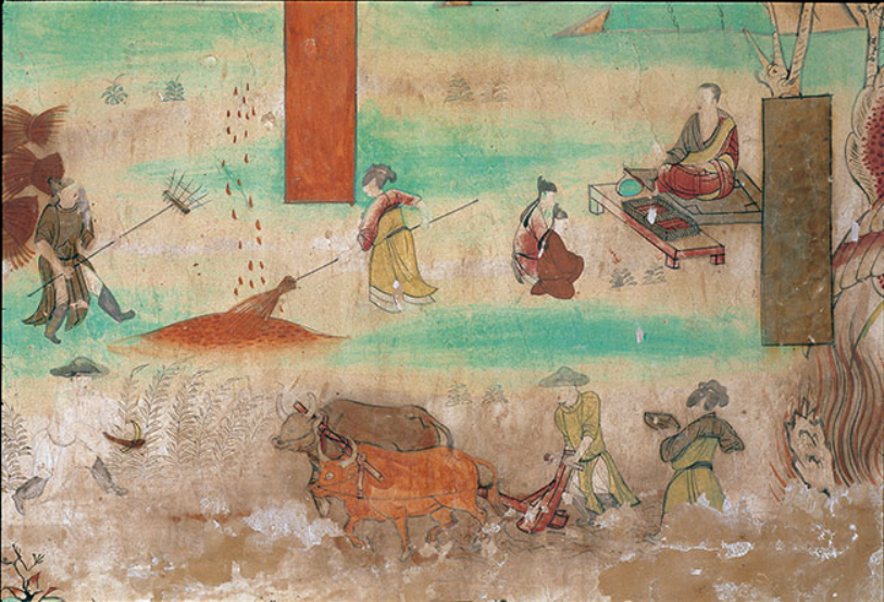 北壁-弥勒经变之耕种图-中唐