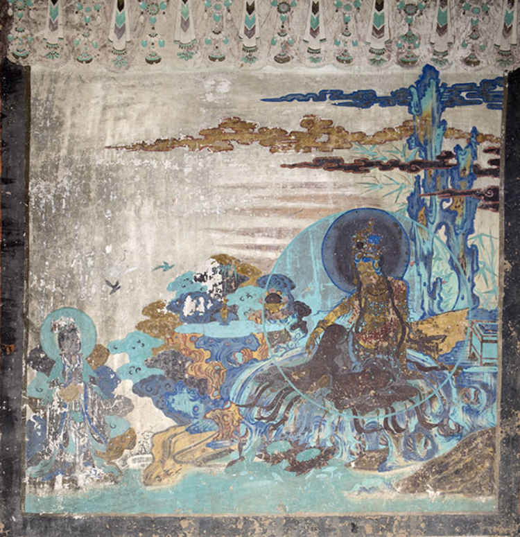 北侧的观音肩披绿色大巾,下穿红蓝二色裙,左手抚左膝,右手持飘带自然伸到胸前,神情悠闲地坐在岩石上,似乎正在仰望寂月夜凝神遐思,又似乎在聆听世间疾苦,准备随时救苦救难。观音一侧的岩石上摆放着花篮和插有柳枝的净瓶,身后灵石矗立,岩石后面露出绿竹。脚下碧海茫茫,海面上一童子正乘云而来,合掌向观音礼拜,这就是善财童子至普陀珞珈山参拜观音的情形,即“童子拜观音”。天空彩云浮动,一弯新月高悬天际。大海岸边的平地上,一位年轻英俊的汉族僧人,身披袈裟,双手合十,仰首虔诚地隔水遥礼观音。僧人身后有一位头戴金环、披散着头发、形貌如猴子的男子,右手举到额前,遥望远方,左手牵着仅仅露出头部的马。此画面表现的就是唐僧取经的故事,青年僧人就是玄奘,猴脸人物就是孙悟空。在历史上,玄奘取经是确有其事的。唐太宗贞观元年(627年),28岁的玄奘便走上了西行求法的历程。玄奘取道瓜州,出玉门关、过五烽,经莫贺延碛大沙漠而至印度。玄奘曾在瓜州逗留月余,与瓜州人民结下了不解之缘。玄奘取经故事在瓜州流传深远,最终进入画家的视野,绘制在榆林窟的壁画中。
