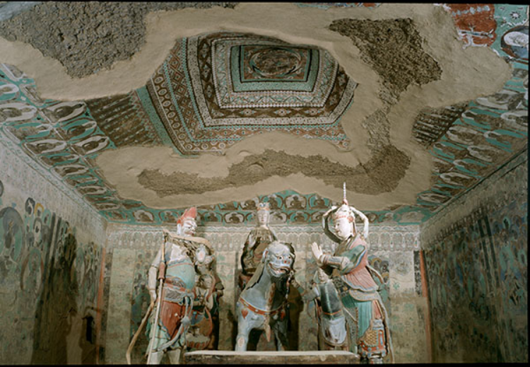 窟顶藻井井心绘蟠龙,佛教中龙是护法的天神,传入中国后,与中国传统文化中的龙合二为一,因而在中国的佛教寺院和石窟中,龙的地位特别受到重视。中国传统的龙源远流长,起源于距今八千年的新石器时代,人们出于对大自然的崇拜与五谷丰登的美好祈愿,赋予龙翻云赋雨,兴风作浪的神力。古代中国的统治者把龙作为皇权和神权的象征,所以龙具有至高无上的权力和不可侵犯的地位。数千年来,龙已渗透到中国社会的各个方面,成为中华民族的象征、中国文化的象征。但最初的龙形象与蛇差不多,可见龙的想象源于蛇。后来在漫长的历史发展中,龙的形象逐步丰富起来,到宋元以后,龙拥有马头、鹿角、蛇身、鱼鳞、鹰爪、鱼尾等等奇异的特征。本窟藻井中心的龙,身体弯曲成环形,正昂首张开大口,龙有四爪,身体以白色和红色点缀出鳞甲,使龙身光润而有立体感。龙的周围以黑白红绿等色相间叠晕而成逆向旋转的两个圆环,具有很强的动感,尤其是外圈的以黑白红绿诸色相间绘制的环状图案,形成急速旋转的动势。衬托出龙的动感。圆环外绘出舒展的云纹。井心外有多层边饰,分别为回纹、连珠纹、波状花卉、菱形花纹、小团花等。与旋转的龙形成方与圆、静与动的对比,具有强烈的装饰效果。土红色与石绿、白色相间,表现出绚丽的效果。