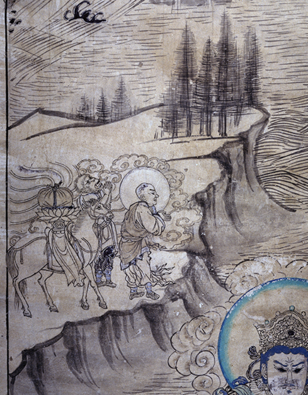 本窟西壁门两侧分别绘有文殊变与普贤变。文殊菩萨专司智慧,称为“智慧第一”,与“德行第一”的普贤菩萨常常是释迦牟尼的两大胁侍菩萨。西壁门北的文殊变绘文殊菩萨及眷属在云海中行进,上部有雄奇的山水为背景。文殊菩萨手持如意安详地坐在青狮背莲花座上,目光专注地俯视下方,形象丰腴、俊雅、坚毅、沉静,身上的飘带随风飘扬,神情优雅,身姿婀娜多姿,宛然一位温文尔雅、慈祥和善的贵妇人形象,在月光般头光和身光的映衬下,更有一种难以言喻的冷峻美。象征威猛、智慧的青狮足踏红莲、步伐矫健,西域式武士形象的昆仑奴左手握鞭、右手使劲往后拉着桀骜不驯的狮子。周围的帝释、天王、菩萨、罗汉、童子等圣众,错落有致地簇拥在文殊周围,怡然悠闲地漫步在云雾茫茫、飘飘荡荡的云海之上,10余位侍从形象形成了共同渡海前行的壮阔场面。文殊身后群峰耸立、奇石突兀、云兴霞蔚、迷雾蒙蒙,山峦楼宇隐现于烟云山水之中;彩虹横跨群峰,古刹隐藏幽谷。这个美丽神秘的地方就是文殊的道场清凉山,相传中国的五台山就是文殊的道场。