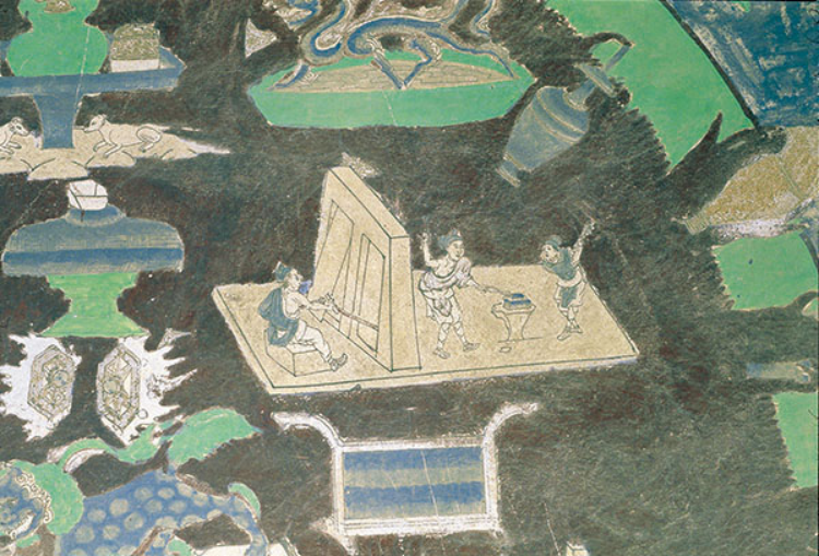 酿酒:画面上有两位妇女,一人蹲在灶火前,一手正往熊熊燃烧的火中添加薪柴,一手拿着吹火筒准备随时吹火,她身边的空地上摆放着高足碗、酒壶和木桶。另一个妇女站在塔式蒸馏器旁,一手伏在灶膛上,一手举着酒杯,俯视着烧火的妇女述说着什么,似乎就是在告诉烧火的妇女自己品尝了美酒后的美好感受一样。我国酒文化源远流长,战国时期的《世本·作》:“仪狄做酒醪变五味”,这是造酒最早的文字记载,汉代许慎《说文解字》“古者仪狄作酒醪,禹口尝之而美,逐疏仪狄。杜康作秫酒”,曹操《短歌行》:“对酒当歌,人生几何?何以解忧,唯有杜康”。所以,后世的人们认为杜康是中国酿酒的祖师爷。杜康是否是我国酿酒的祖师爷现在不可而知,但可以肯定的是,杜康所造之酒只能是发酵粬子做成的酿造酒(也叫发酵酒或黄酒),绝不是蒸馏酒(也叫白酒、蒸馏酒或烧酒,烧酒是利用酒与水的沸点不同制造出来的)。明代李时珍在《本草纲目》中说:“烧酒非古法也,自元时始创其法。”其实,李时珍的这种说法是缺乏科学根据的。唐代诗人李白:“白酒新熟山中归,黄鸡啄黍秋正肥。”白居易有诗云:“荔枝新熟鸡冠色,烧酒初开琥珀香”;雍陶亦有诗云:“自到成都烧酒熟,不思身更入长安。”说明唐代的人们已经利用蒸馏技术制作烧酒了。本图中的塔式蒸馏器绘制于西夏。1959年,何丙郁和李约瑟两位先生在《中世纪早期中国炼丹家的实验设备》中,考证此图像为烧酒蒸馏器,我国许多科技史的专家经过详细考证后赞同这种说法;1975年,河北省承德市青龙县出土的金代铜质蒸馏器,其制作年代最迟不超过1161年的金世宗时期(南宋孝宗时)。这一切,都为我国的烧酒技术的年代提供有力的佐证。