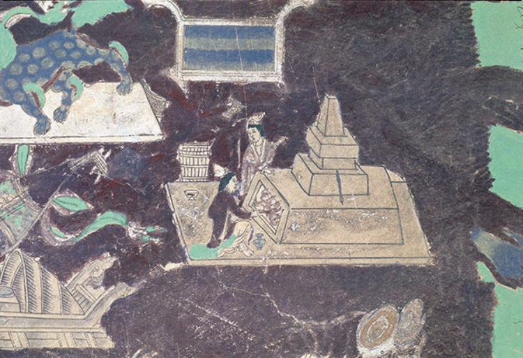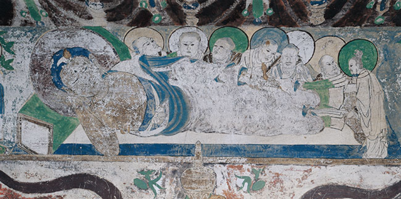 降魔大塔的正上方就是释迦牟尼涅槃图。释迦牟尼右胁而卧头枕在中国式的方形枕头上,右手支颐,左手放在身上,双足并拢,表情非常平静、安详、淡泊、超然。六身举哀弟子站在释迦牟尼身后,表情各不相同。佛足前,站立着一身老年妇女,身穿长衫,头发扎成发髻,表现的是佛的母亲摩耶夫人,她听说佛即将涅槃,从忉利天宫下凡来到人间亲自见佛一面。佛头的一侧画四身佛,佛足的一侧画三身佛和一身菩萨(最后一身为菩萨),加起来就是七佛一菩萨。表现的是过去七佛毗婆尸佛、尸弃佛、毗舍婆佛、拘留孙佛、俱那含牟尼佛、迦叶佛、释迦牟尼佛和即将成佛的弥勒菩萨。涅槃,意思为灭度、入灭、寂灭等,是佛教修行所有达到的最高理想,是对生死、烦恼诸苦的彻底断灭后而获得的一种最高境界,从而达到不生不灭、永不轮回的境界。因此,涅槃也是释迦牟尼一生中具有里程碑意义的大事。从画面所处的位置看,涅槃图处于顶端非常重要的位置。