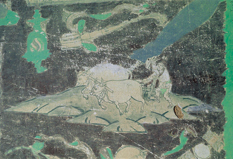 牛耕:农夫右手扶犁,左手扬鞭,一黑一白两头健壮的耕牛正拉着一具直辕犁奋力向前犁地。这种牛脖子上架一木制牛鞅子,两侧系两根绳子用来拉力的方式,至今仍然是利用牛力耕地、种田、拉车等传统方式。不过,壁画中的直辕犁出现在西夏社会生产生活中已经是落后的农具了,在敦煌莫高窟的唐代壁画中已经出现了比直辕犁更加先进的曲辕犁了。这些也从侧面反映了西夏民族从游牧骑射向农耕定居缓慢发展的进程。
