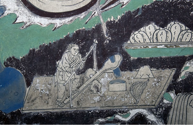 舂米:一位裹着头巾,上身穿着交领短衫裤,脚穿麻鞋的农夫双手扶着支架正在用力踏碓。壁画上的碓,是用一根固定的木杠架起另一根木杠,两根木杠形成十字形,在上面能够活动的木杠的一端装上一块圆形的石头(或木头),然后用脚连续踩活动木杠的另一端,石头就连续起落,以此来去除石臼中粗米的皮。此图中的碓比用一个石臼用杵捣米前进了很多。一旁有舂好的米和簸箕。