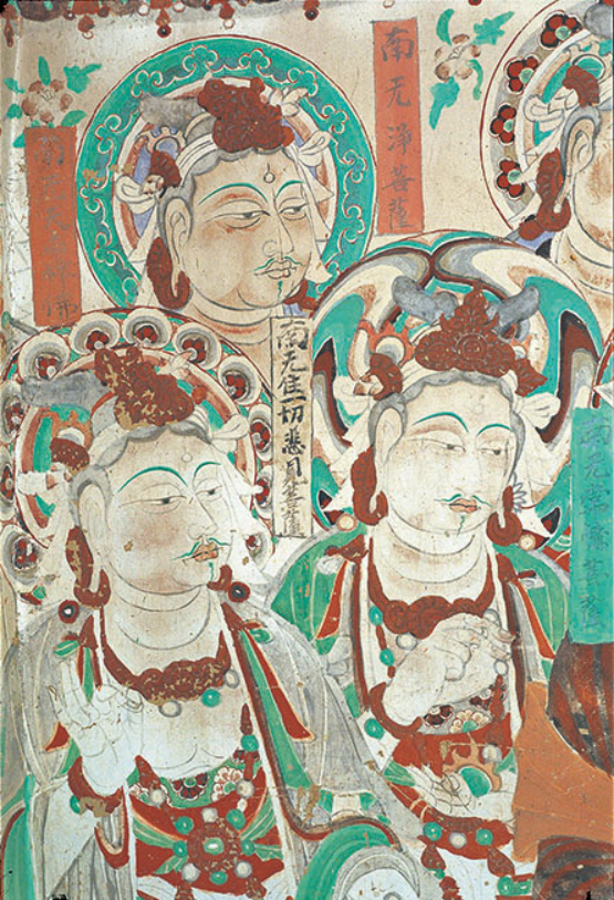东壁的弟子和菩萨,神情沉静稳重,菩萨和弟子旁边榜题犹存,如:南无海天菩萨、南无药王菩萨、南无智山菩萨、南无卢舍那菩萨、南无梵王、南无日光菩萨,舍利弗智慧第一、阿难陀总持第一、罗睺罗密行第一、迦旃延论议第一、优婆离持律第一等等。其中,佛弟子的榜题在许多佛教典籍中有明确的记载,是释迦牟尼“十大弟子”。十大弟子中舍利弗、目犍连、大迦叶、须菩提、福楼那、迦旃延六人属婆罗门贵族种姓;阿那律和阿难是释迦牟尼的堂弟,罗睺罗是释迦的儿子,这三人都属于刹帝利贵族;优婆离是释迦身为悉达多太子时的近侍,似乎也属贵族。十大弟子都是释迦牟尼亲传,都是亲耳听闻佛陀言教而成为觉悟者,是众多弟子中道行突出的十人,在协助释迦牟尼弘法的几十年时间里都立过大功,是佛教中的重要人物。