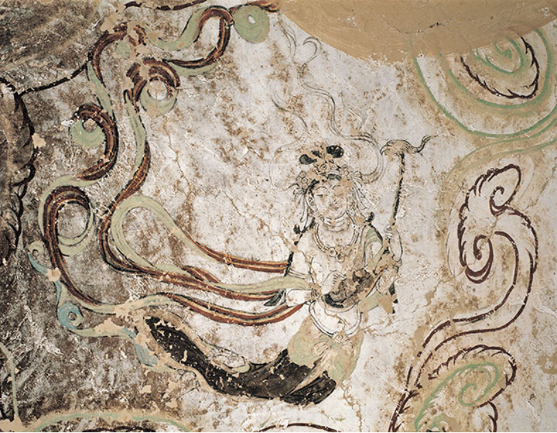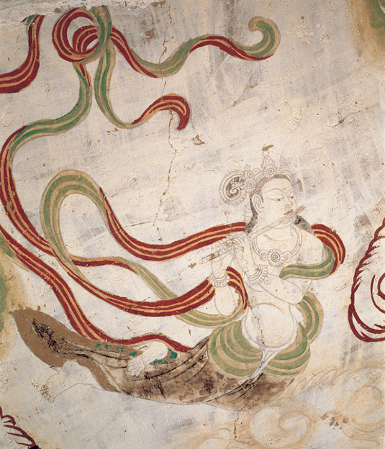 窟顶南端的飞天躯体丰腴,表情温婉,目视前方,正专注地吹奏着横笛,飘带状如波浪在身后翻滚,表现出一种音乐的气氛。