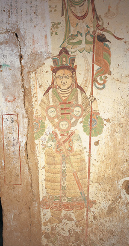 前室东壁南侧还有一身天王像,其装束与前两身有所不同:身着长身甲,胸前系人面护胸镜,头戴花蔓冠,腰佩长剑,左手持竖立于地的长戟,身后有如牛角状的圆光,两腿自然分开正面站立,左右前后没有任何侍从。第15窟前室共绘制了四身天王,但大小不等,规模悬殊,风格迥异,可能是不同时期所画,但是为什么他们都很热衷于绘制天王呢?这是因为中唐时期的瓜沙地区已经失去了往日的安宁,绘制天王菩萨都是为了祈求平安幸福,吐蕃统治敦煌期间,人们走路都要祈求天王保佑。